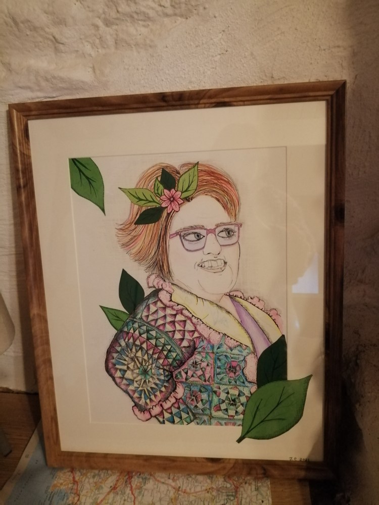 Today is my birthday and I have had a lovely day. We had an indoor barbecue with a few friends. Everyone brought me something which was really kind. I was completely blown away by the present that I was given to me by my friend Janice. This is a drawing that she has done of me, from a photograph on my Fromthesheshed Facebook page.