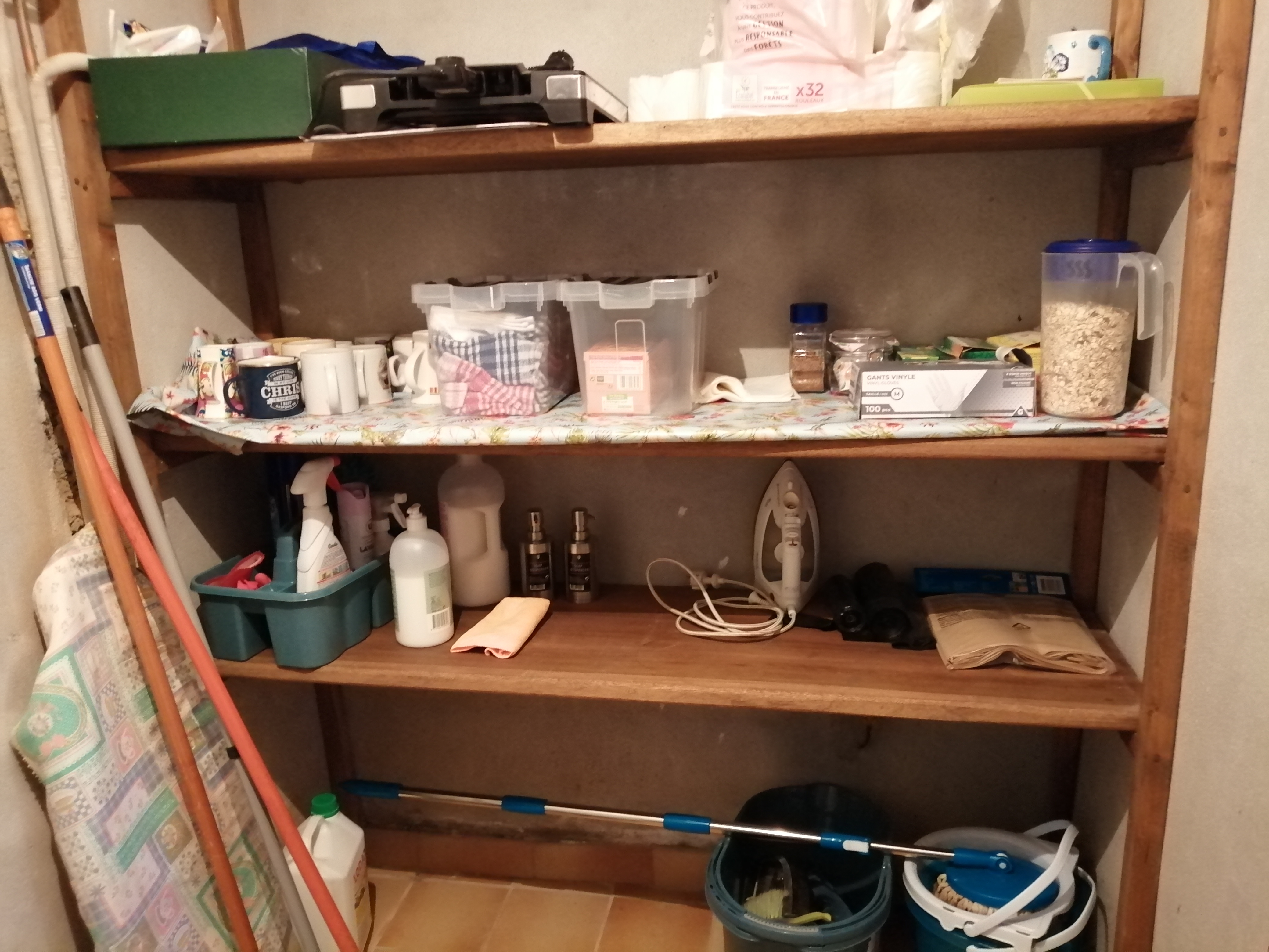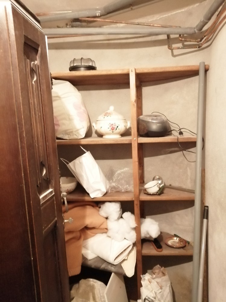 It is fair to say that we opened our gite d’etape before we were completely ready and fully organised. So today was about becoming organised. On the ground floor is a very small room where it is actually possible to keep many of the things that are needed for running the business. However it had not been cleaned or organised since some of the new pipe work for the plumbing for the additional bathrooms went through. There was also a wardrobe in there, along with a sack of cement and a sack of tiling adhesive. Anyone who knows my husband and I will not be entirely surprised! However these items are not usually stored alongside bedding and dried food stuffs, which is what I need to use the room for. So today was about removing the inappropriate items, giving the space a thorough clean and then organising the space in order that it can be used effectively.