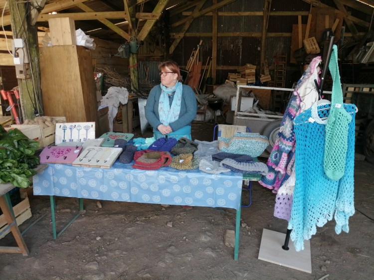 I got my other half to take photos of me and the stall set up and I have decided that I need to learn to smile in photographs, I feel that I look really severe! Last night I sold some items. A friend had said that she wanted to come and she arrived and bought two items, which was great. For most of the evening a young boy coveted a pair of chenille slippers or pantoufles as they are called in French. (I rather like the French word is sounds comforting in a way that slippers doesn’t). The pantoufles were turquoise chenille and I had thought that they would appeal to a girl. I am someone who has spent years working to challenge gender stereotypes and I am horrified to see that I was applying them myself. After various visits to my stall in which he gently stroked the pantoufles he persuaded his dad to give him the money and arrived clutching the money tightly in his hand. Once he had paid for them he spent the rest of the evening wearing them on his hands. I did point out that they weren’t gloves, he said, ‘I know but I have shoes on’. We agreed he was quite right. It was lovely to see someone so pleased with something that I had created.
