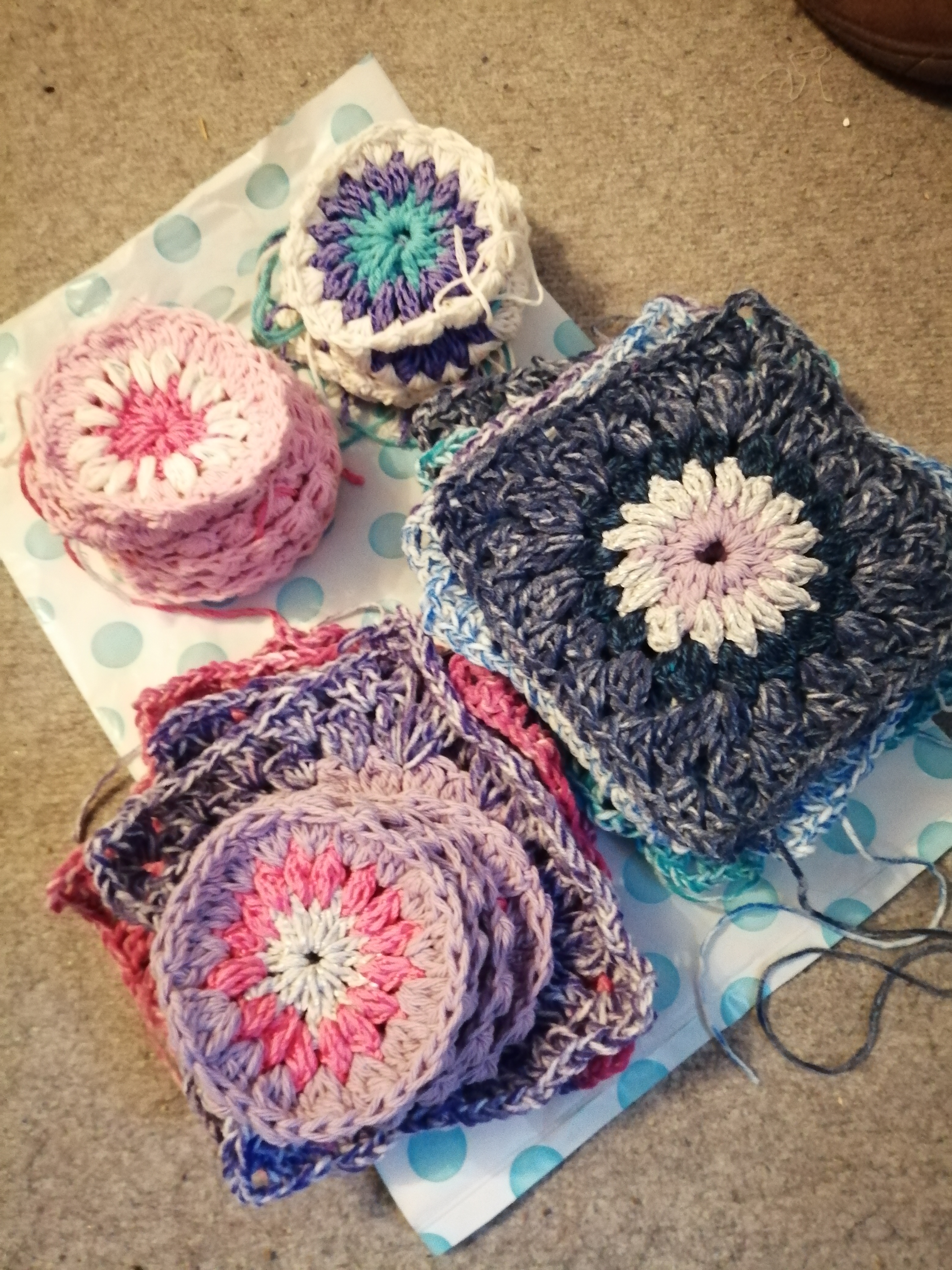 I then decided I should focus on an order for a client. She has ordered a coatigan similar to the one I made for myself a few weeks ago. The main part of the coatigan is made up of 32 starburst granny squares. You start with the starbursts, and then crochet around them to create a square. All 32 have now been created and by the end of today I will have turned half of them into complete squares. So I feel that I am making real progress. Seeing piles of squares created is very satisfying.