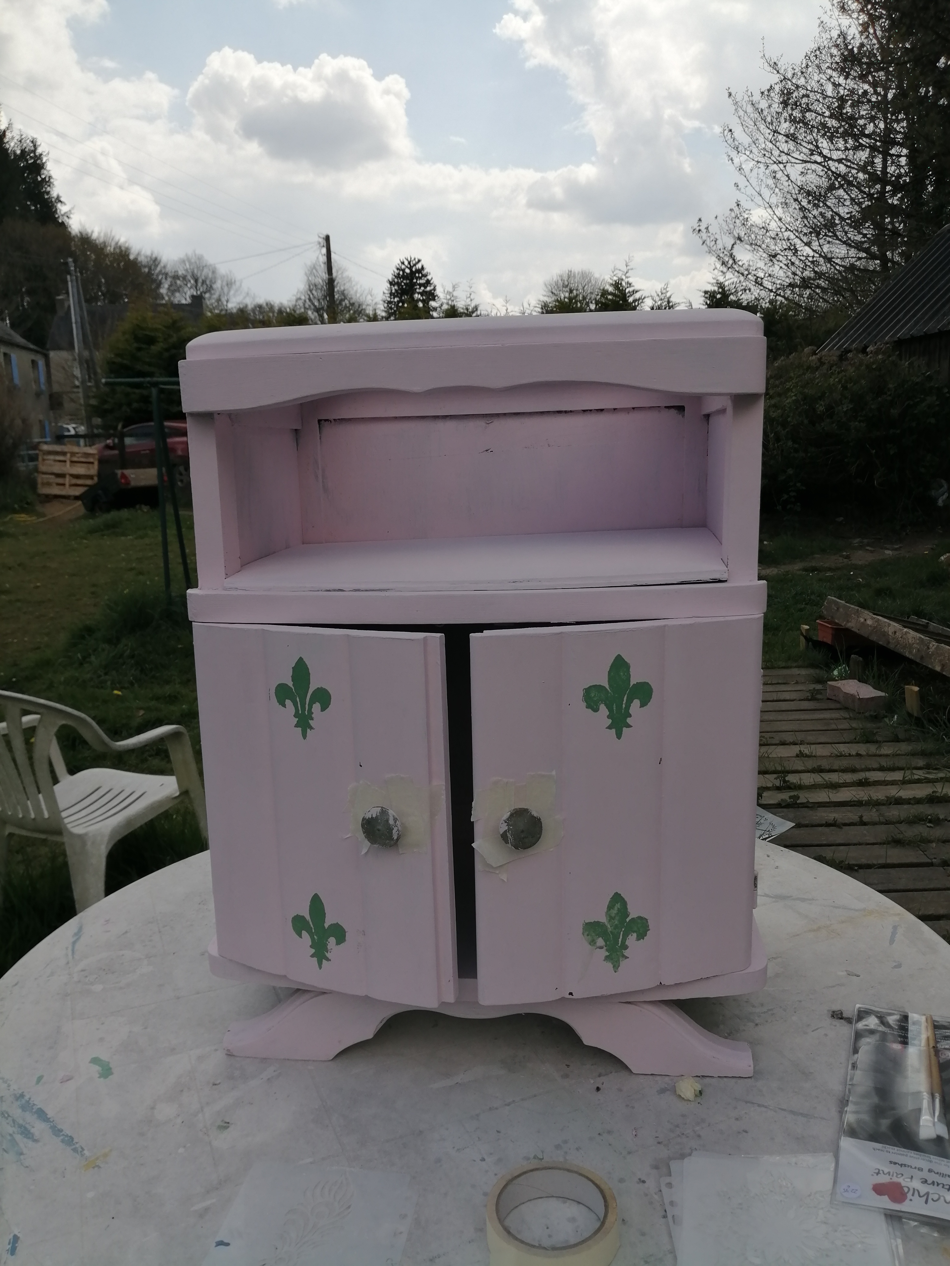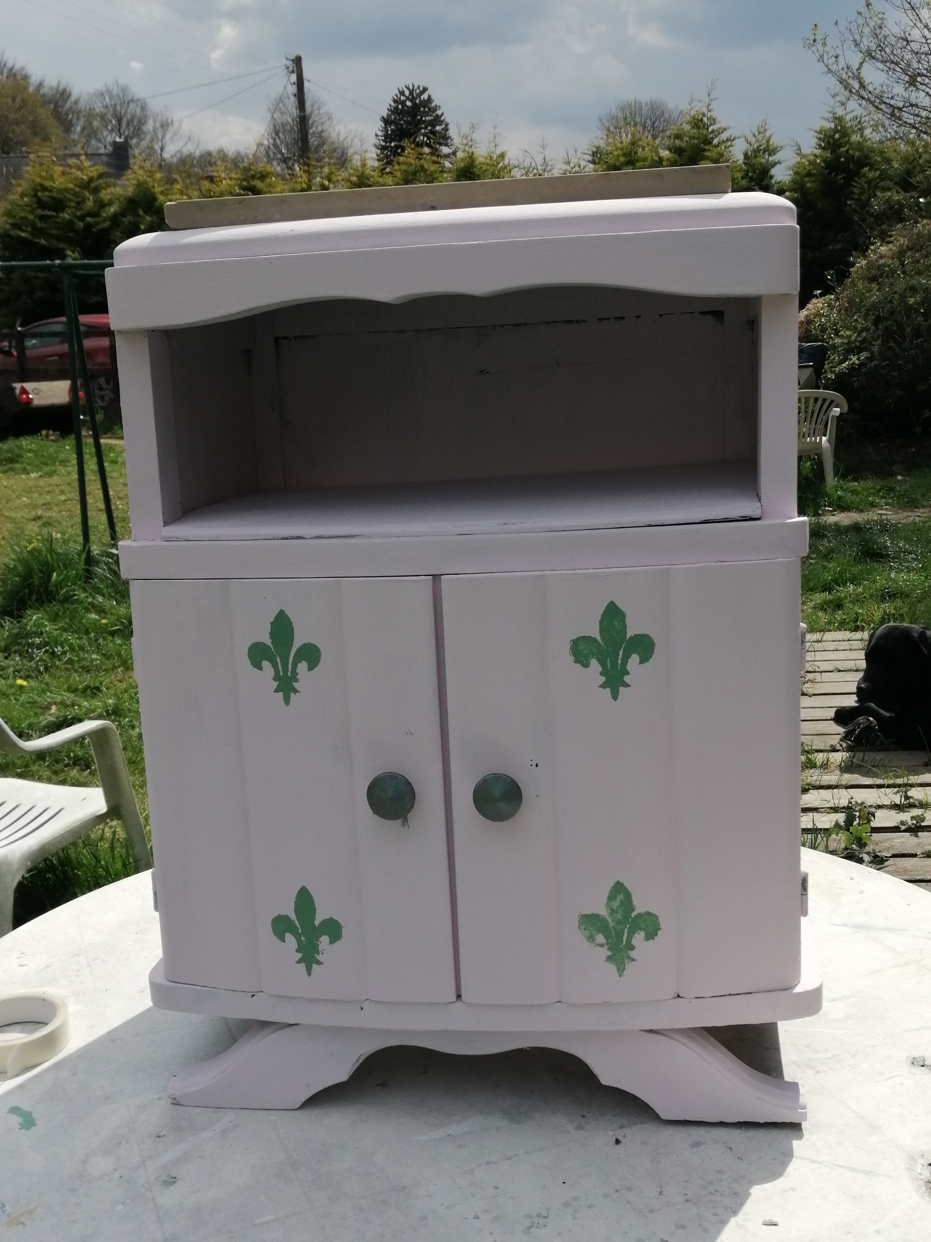 So after walking the dogs I thought that I’d have a go at the cabinet that I started up-cycling a week or so ago to go in the bathroom. I was disappointed to see that much of it was need of a third coat. I use a chalk paint (Frenchic) which usually only needs two coats. However I put the third coat on. Whilst I was waiting for it to dry I found the stencil that I intended to use on it. I realised that it would not work. The curved surface of the doors with the large stencil spaces was asking for trouble. So I spent some time looking at all of my different stencils and trying to find something suitable. In the end I discovered a fleur de lys that I didn’t even know that I had. I decided that keeping it simple would probably be the answer. It was at this point that it became an oh dear moment as several problems set in. The paint that I was using had separated and whilst I had stirred it; clearly not enough, so on the first stencil it managed to run a little. I managed to get the paint into a more usable state. I then noticed that as I pulled off the masking tape it had taken some of the paint with it. By this time I was getting quite fed-up with the project. Since it was only for us, not something that I intend to sell, and it cost 2.50€ plus the paint that I already had, I decided that I was going to dab the problem areas and call it finished. This is what I did. Now it is installed in the bathroom it looks considerably better than what was there before; but far from my best piece.