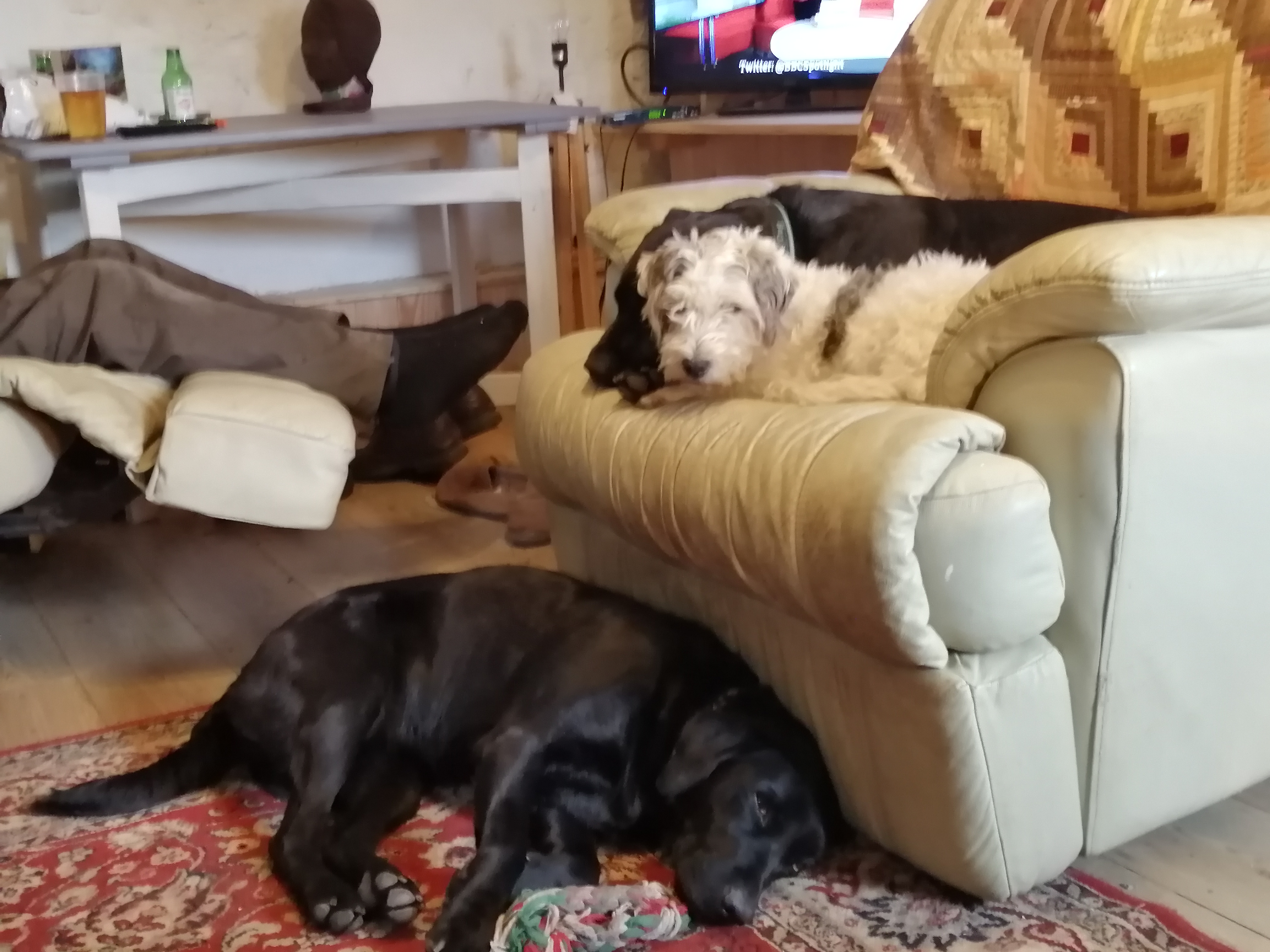Below are some photos of the dogs given that some readers have said that they like to see them. It was Archie’s 2nd birthday a week or so ago so a number of photos were taken of him to share with his brothers and sisters. There is quite a good picture of Archie and Nancy trying to share a chair, something neither of them are particularly good at! And finally all three of them lying down quietly, it does happen sometimes.