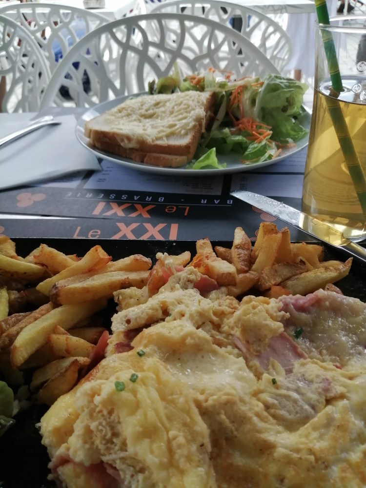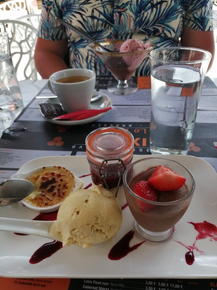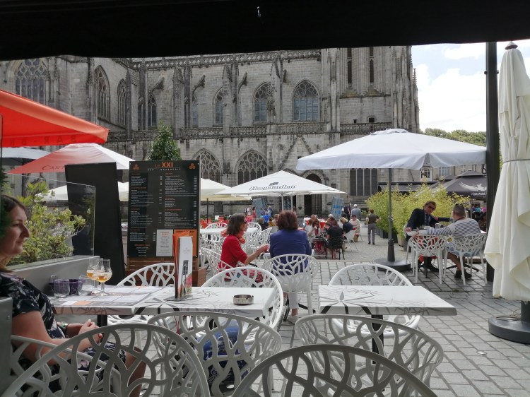My youngest son had to go to the prefecture for his carte de sejour and finger prints today. So we were off to Quimper. Given that there was someone coming to the gite this evening the room changeover needed to be done first. With it being only one room this evening it was a relatively quick job. And a trip to Quimper cannot go without a lunch. We have been lucky with the weather over the last few days, there has been a definite improvement. We were able to sit outside and it was necessary to sit under an awning for fear of sunburn! I haven’t been able to say that for some time. So we had our lunch with a view of the cathedral.