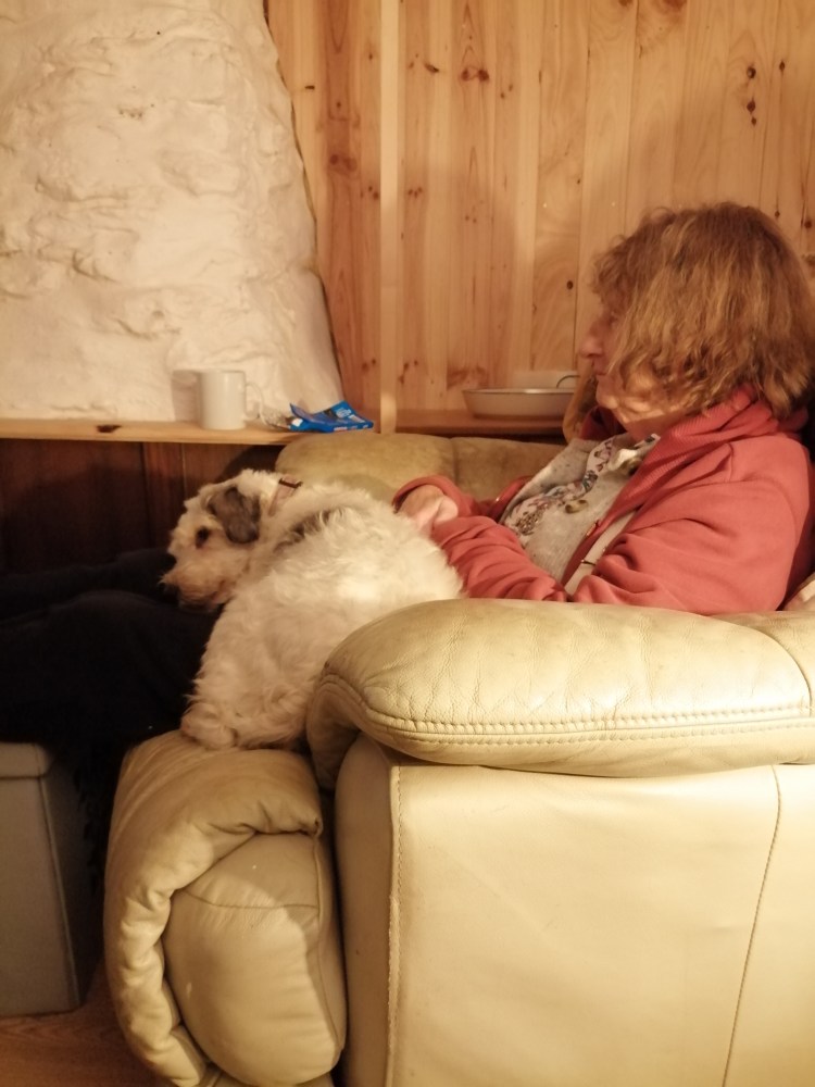 On Sunday we had a walk at Lac du Drennec. Strangely there was still a fog when we were there in the morning. By the time we were back here the sun was out and it was actually quite hot sat out the front of the house. Yesterday was also Nancy’s birthday, she is now 10. She will have you believe that she is an old lady but in terrier terms she is still relatively young. She decided that sitting on Nanny’s lap for the evening was a good idea. She got away with it!