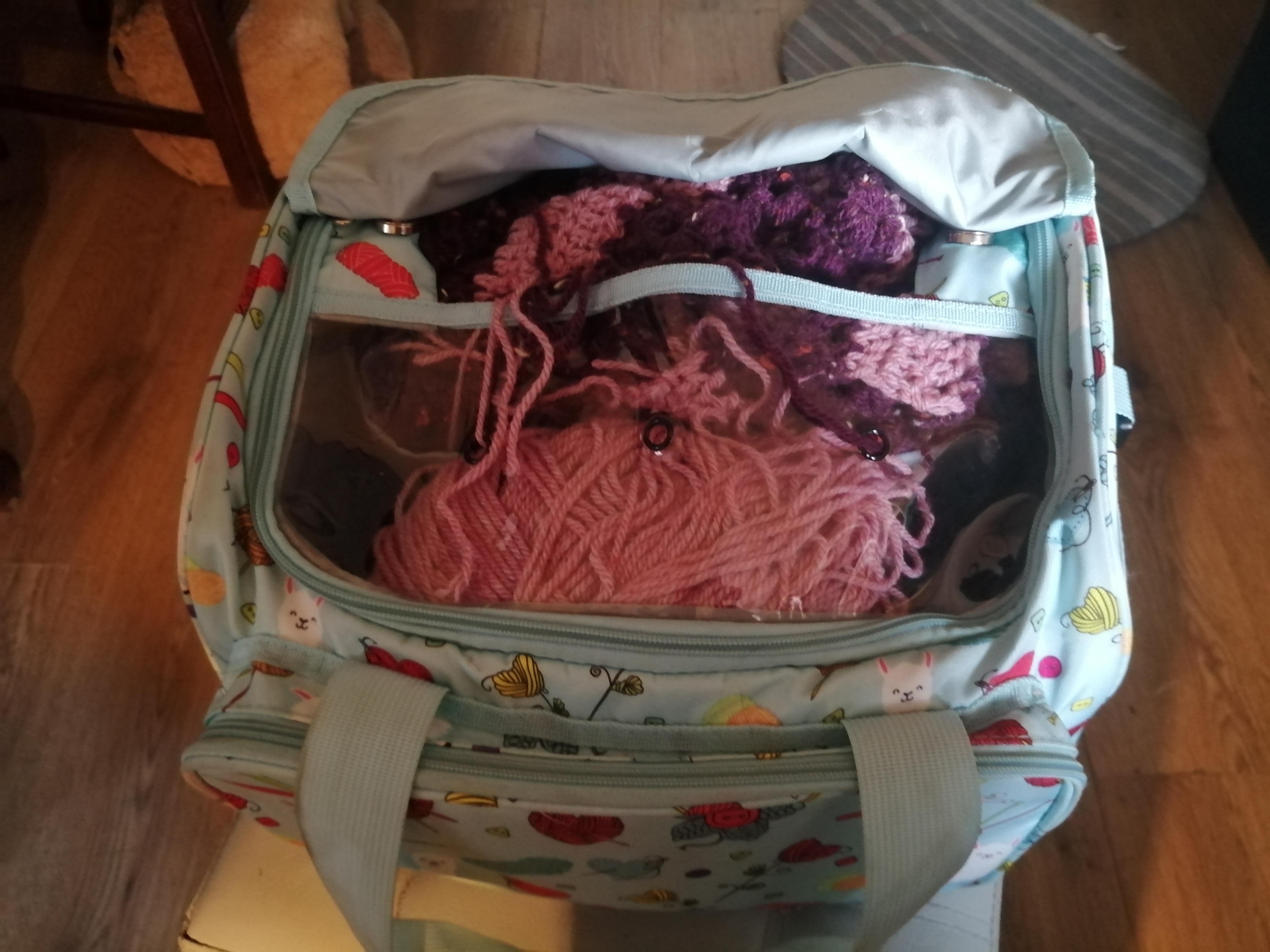 During the day a video popped up on my phone in which someone was trying to sell membership of a crochet magazine. There were freebies if you signed up. One of the items on offer was a project bag. Ridiculously I had almost forgotten that I have a project bag. I knew where it was and that I was storing yarn in it. I decided that using it in the manner intended would be a much better use of it. I have now put the yarn in a storage box and my latest project in the project bag. It even has special grommets for the yarn to come through so that you aren’t chasing it around the floor!