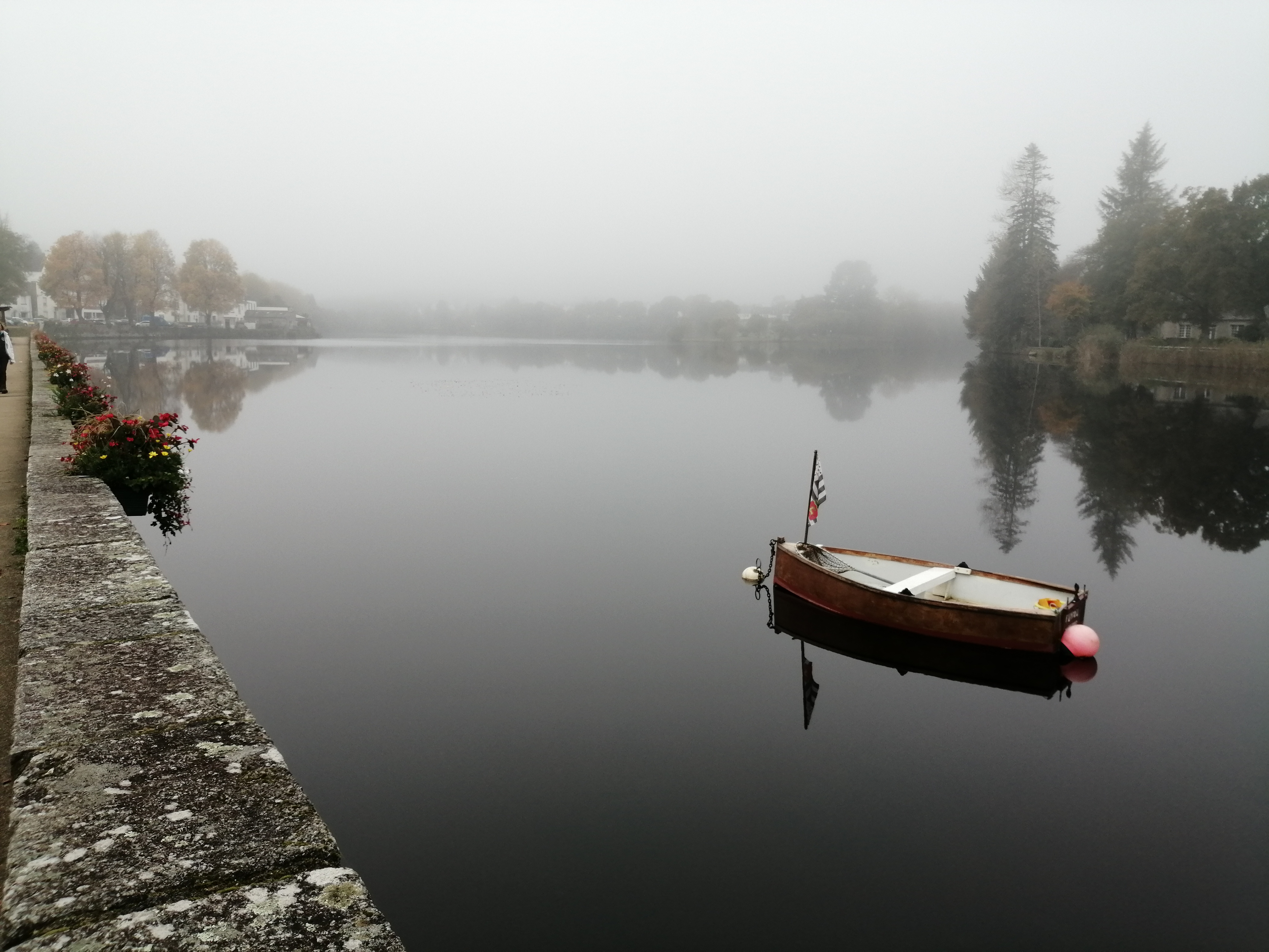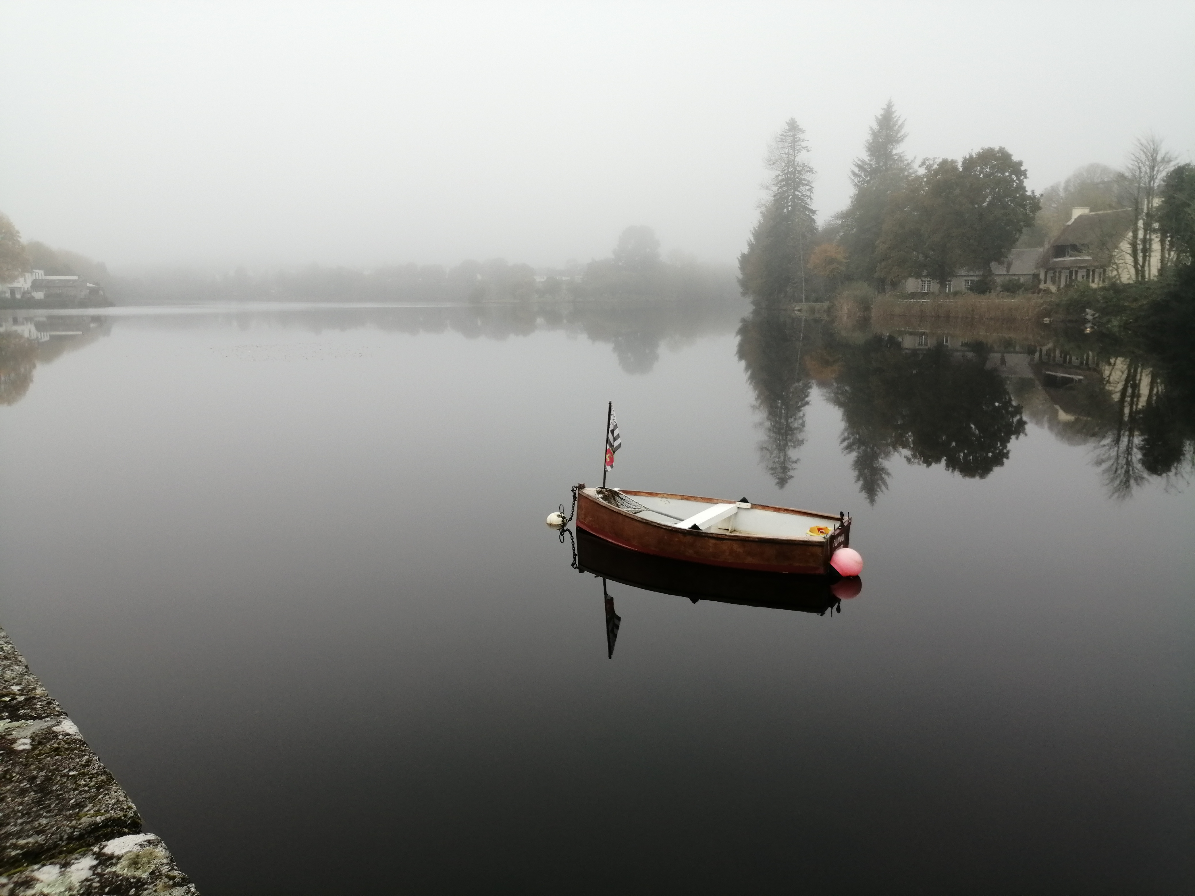 Over the weekend I came close to finishing the hooded shawl that I am currently making. Unfortunately I ran out of yarn. I seem to do this a lot. Partly because I buy yarn for one project and end up using it for another. So first thing this morning I went to Huelgoat to go to the yarn shop. Whilst driving there it was obvious that there was a mist this morning. It looked rather lovely and I decided to photograph the lake on my way back. Well the shop was shut and furthermore there were no other yarn stores that would be open before this afternoon.