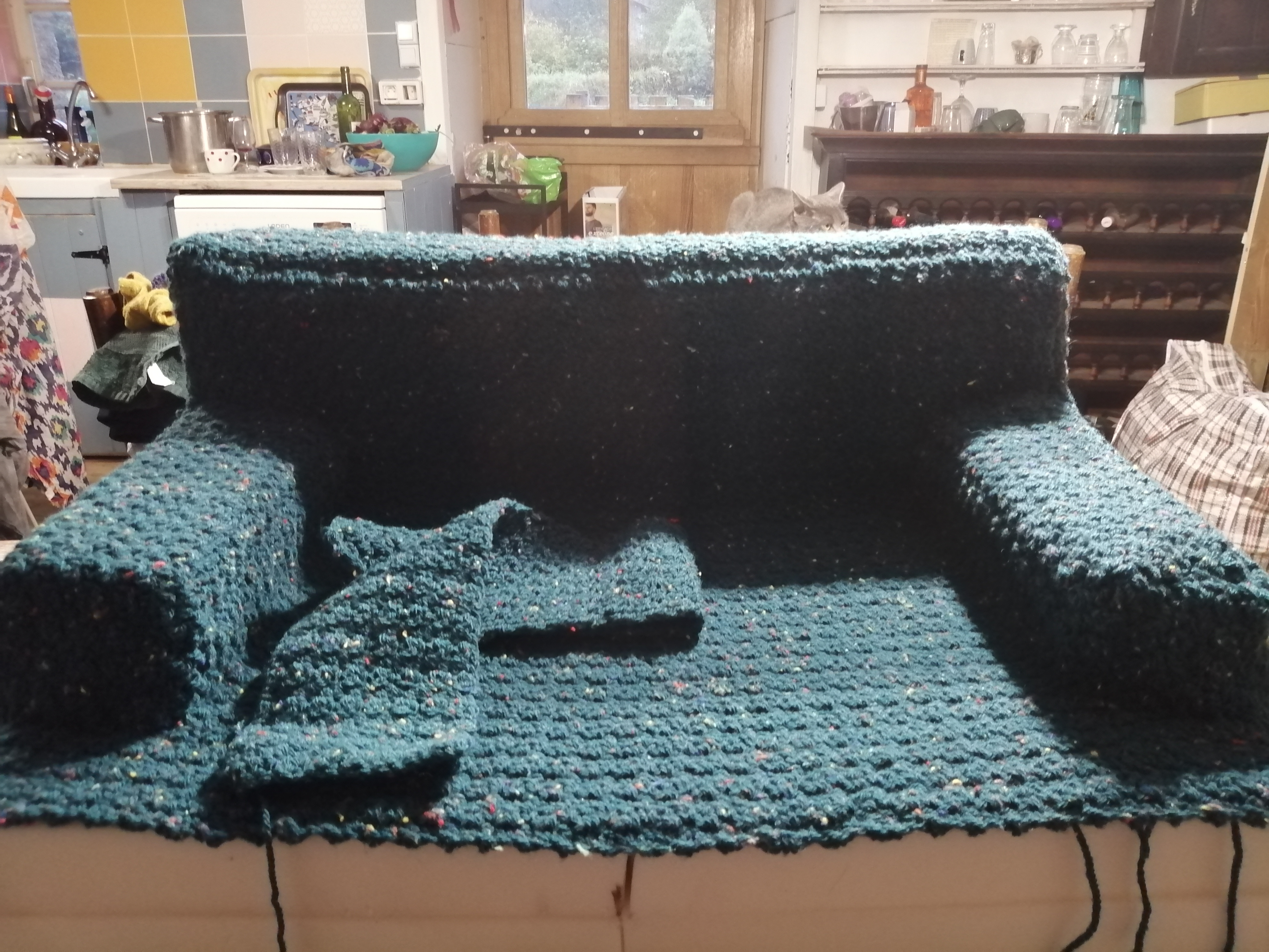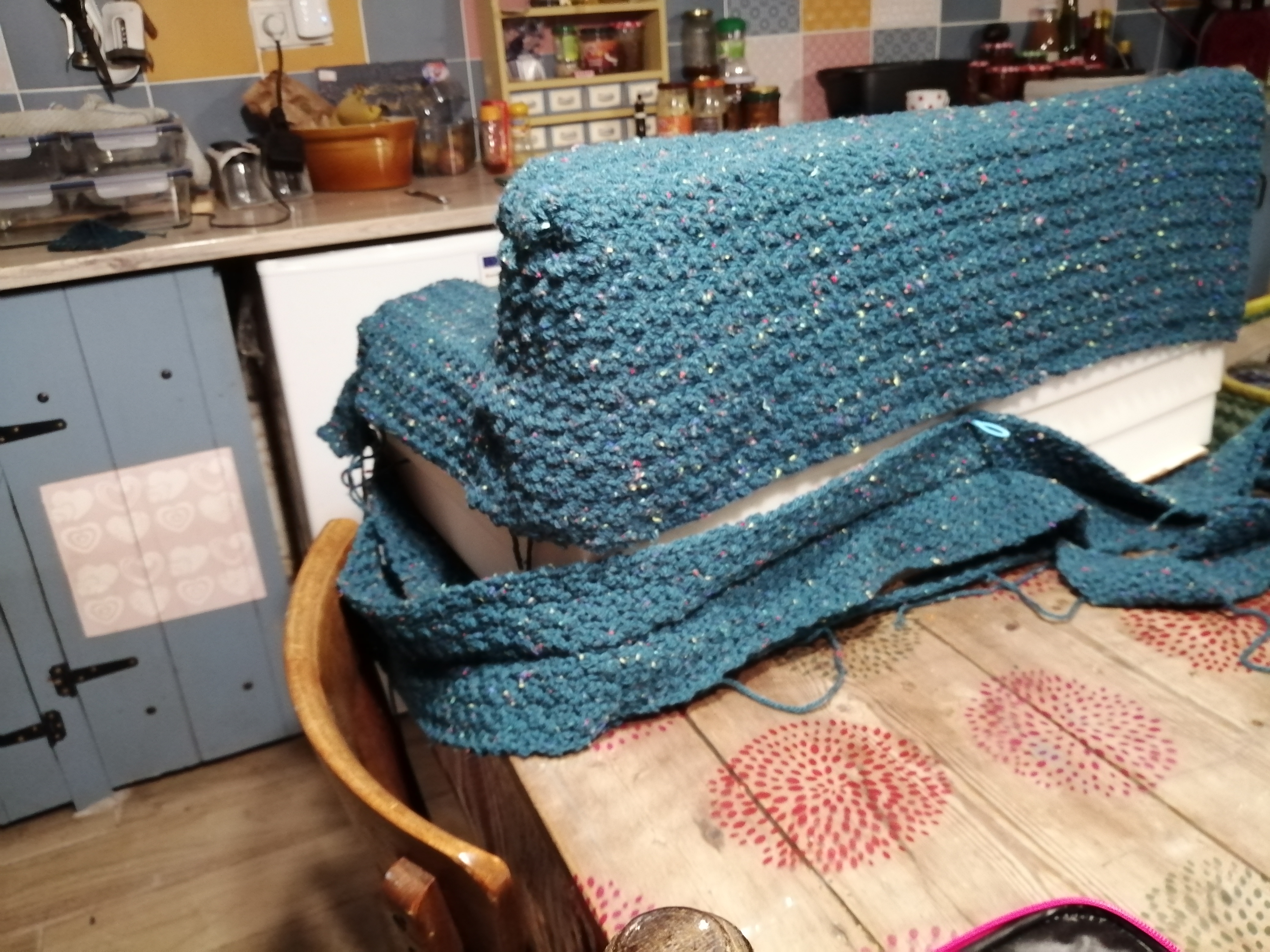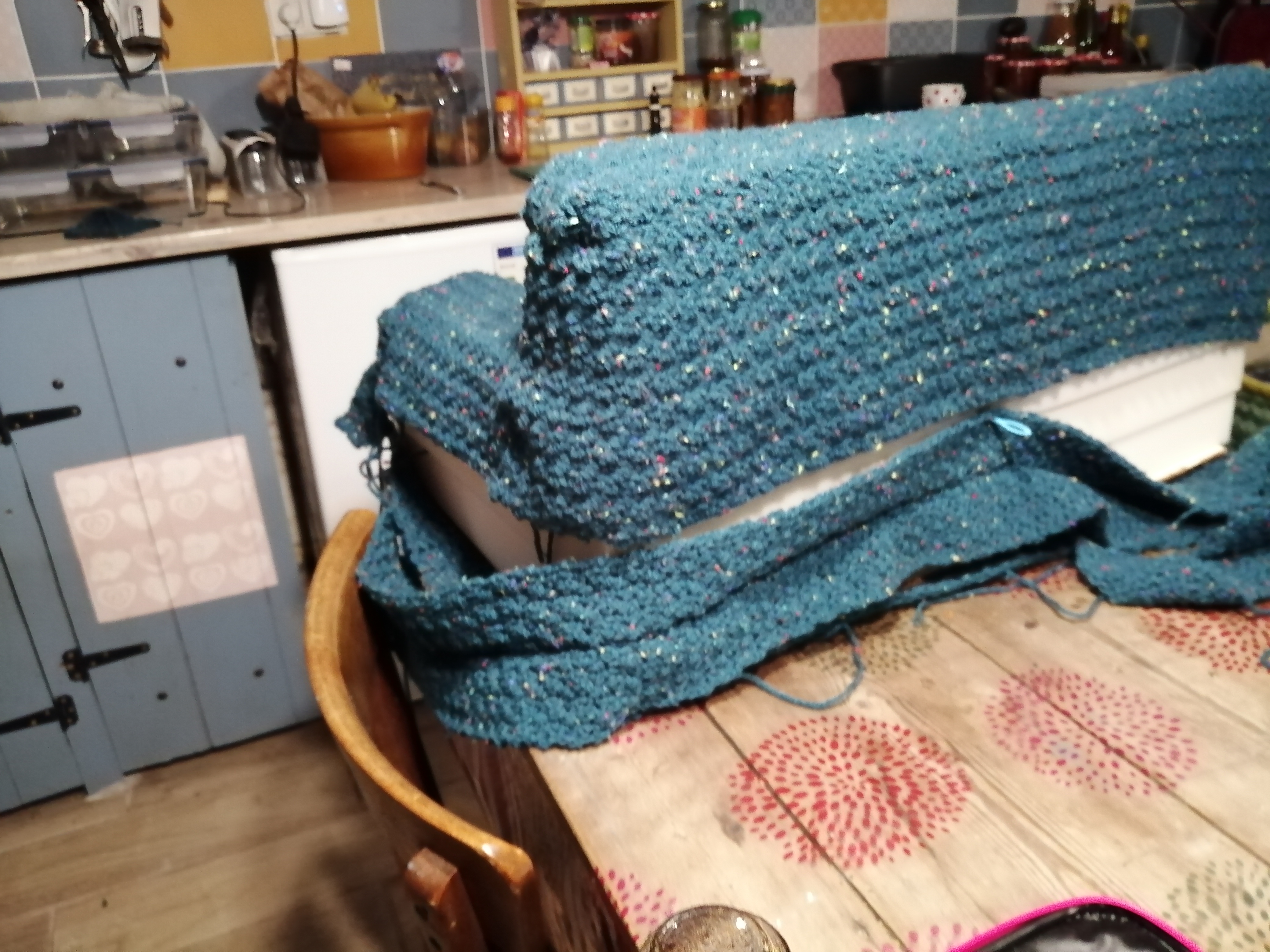For a moment I was annoyed and thought that this laid back approach in France was rather exasperating. I decided that I needed to find something productive to do for the morning. I had been avoiding the crochet airfix kit that I had left in the loft for the last two weeks. I began to sew it together. The instructions are not clear and when I printed the pattern I did so in black and white. The online pattern has since changed! I am making progress however it is going to take some time yet to finish this. I think it will look impressive. I’m not sure that I am going to sell it and I’m certainly not making another one! Final photographs are a little way off.