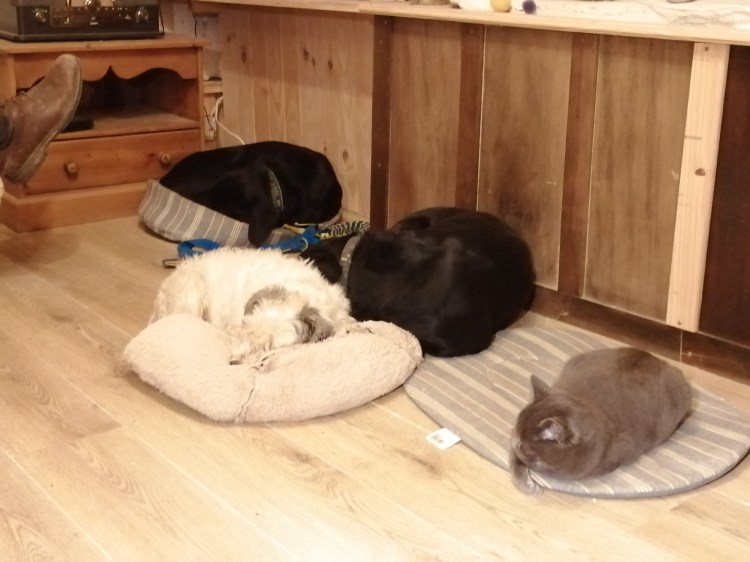 I thought I would include a photograph of the dogs and Zebulon. Last night he clearly decided that he wanted most of one of the dogs’ mats. Archie and Nancy seem to have managed to each have a bed however Mabel was forced to share!