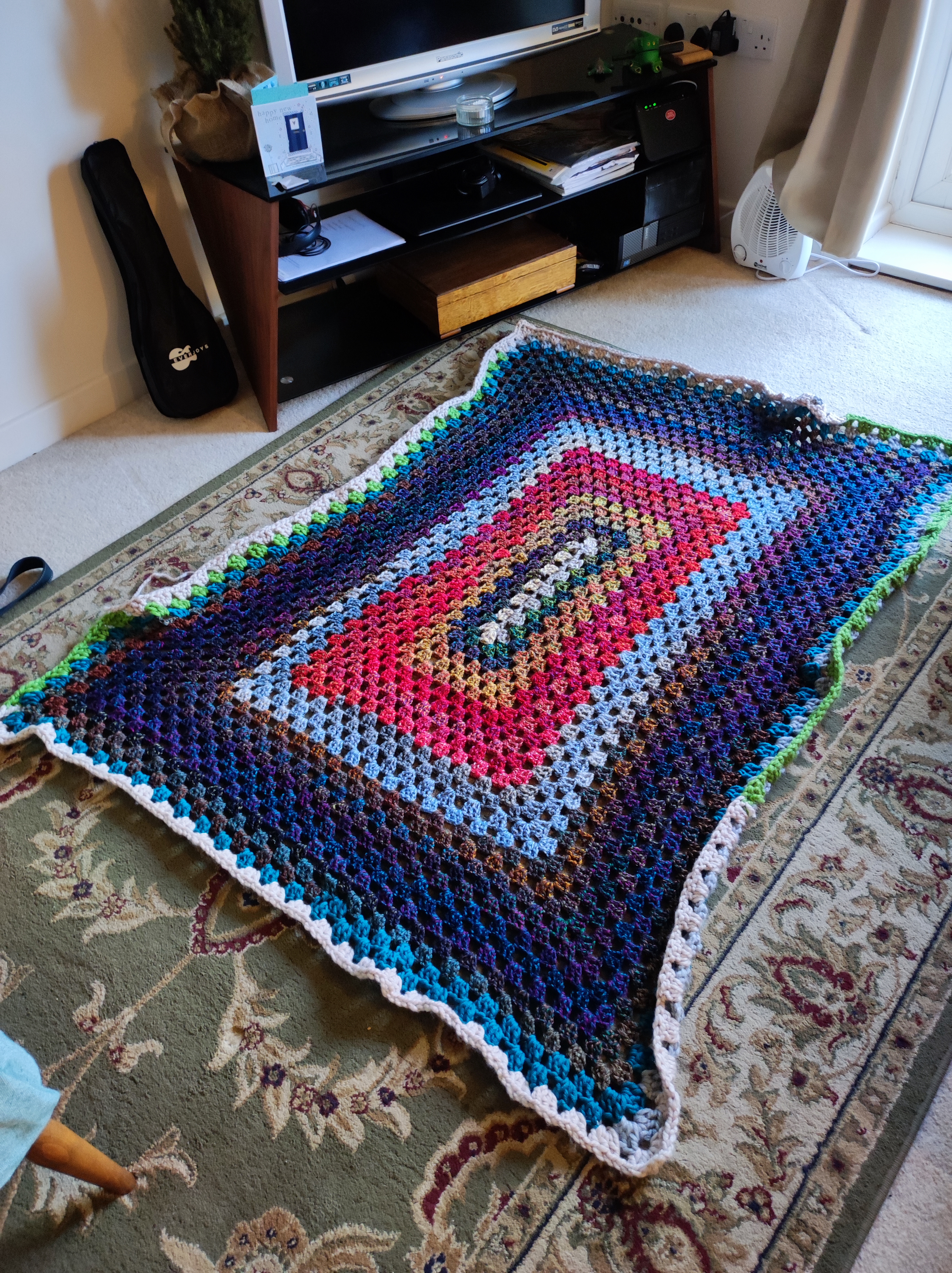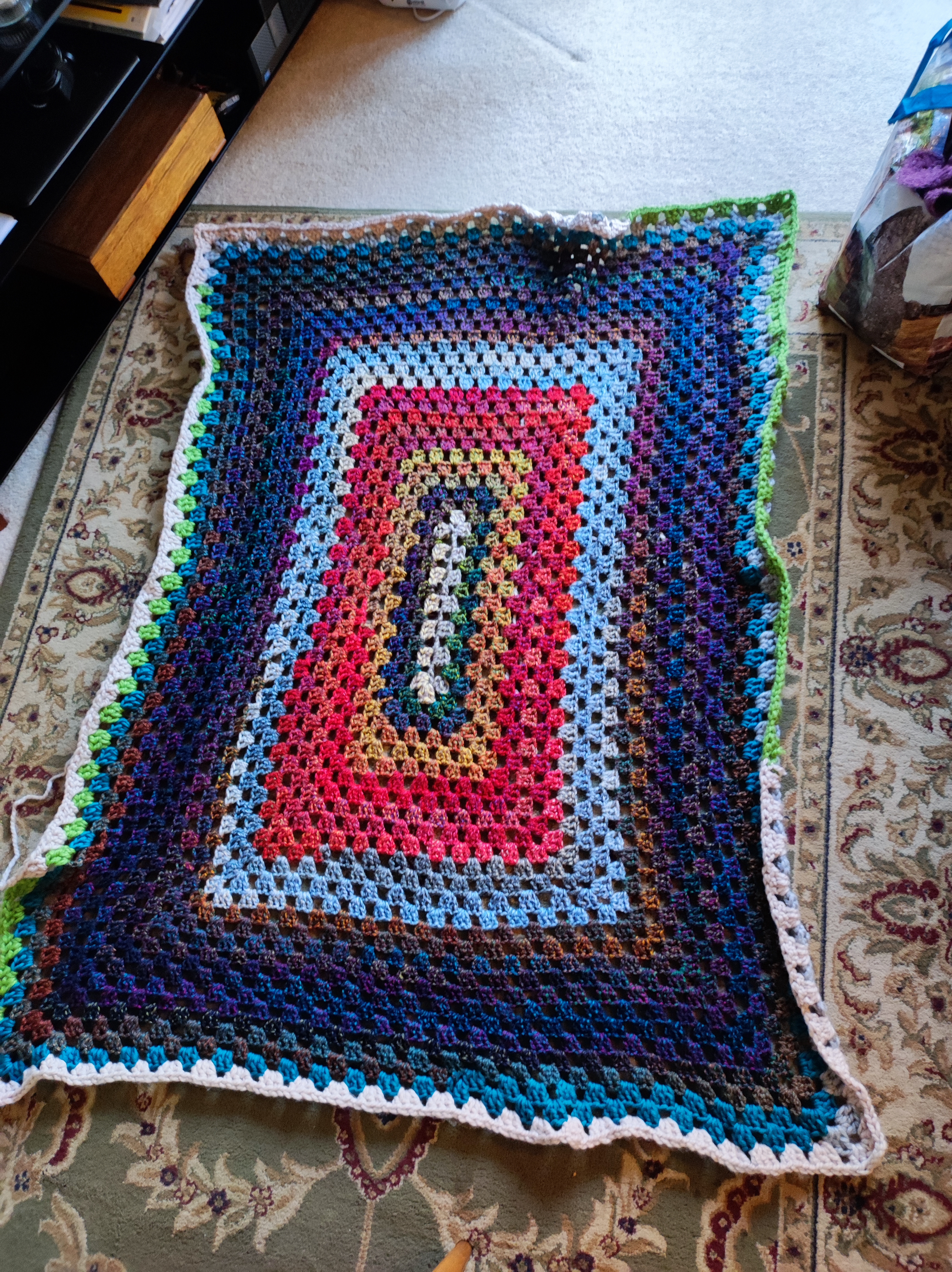 I have been working on a scrap throw. It is the one I started last Monday. Last night I decided it was finished. This morning I changed my mind. However the photo below shows the progress.