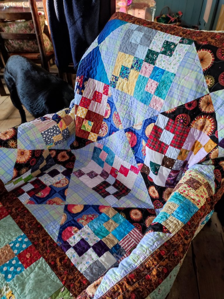 The person whose house we were at today is a friend. We met when she was training to teach and I was returning from maternity leave, so over twenty years now! Her main craft is quilting. She had said a while back that she was going to do a quilt for me. I was absolutely to delighted to be given it today. I have put it over my armchair in front of the fire. I shall be sitting in it knitting this evening.