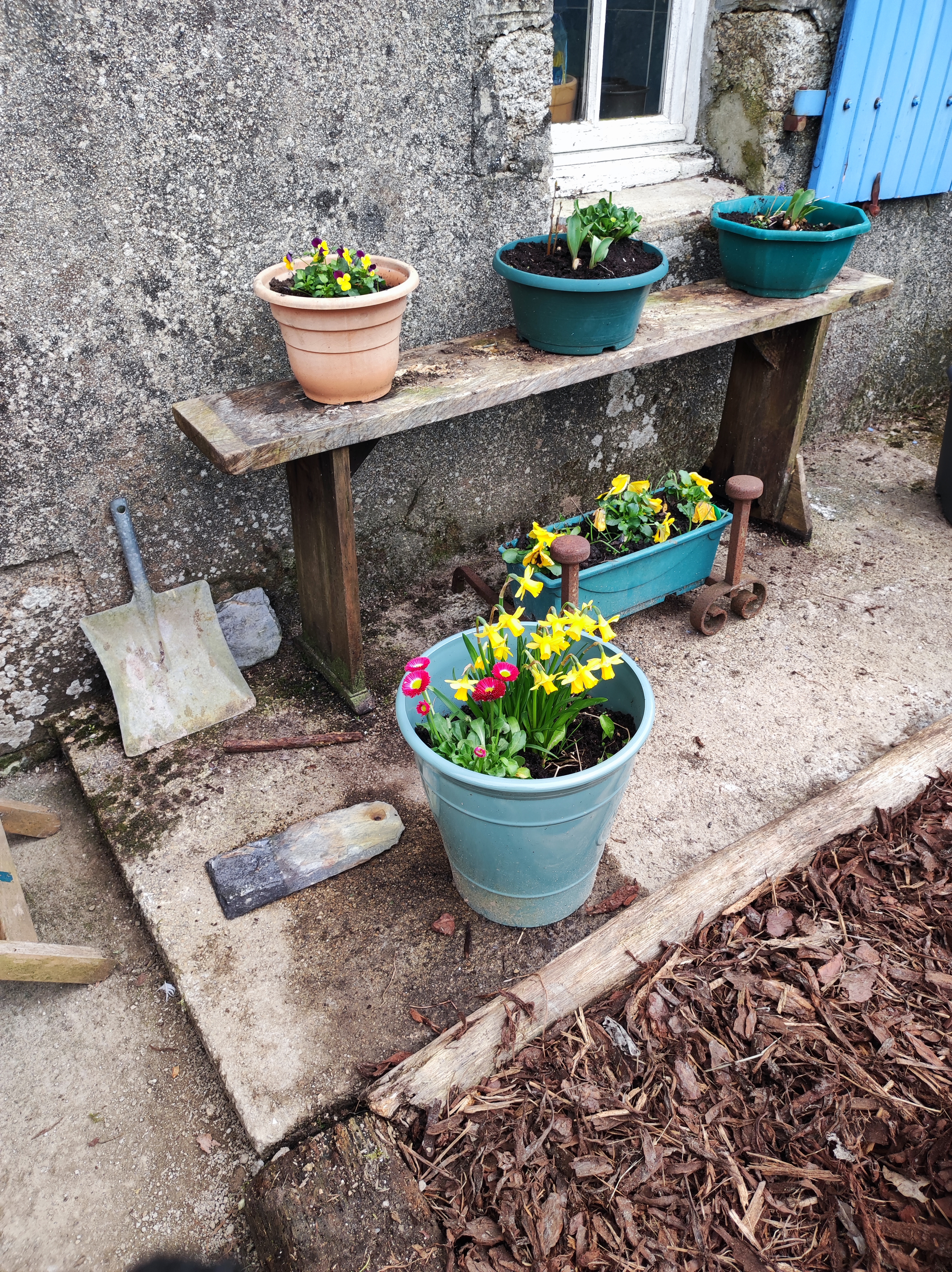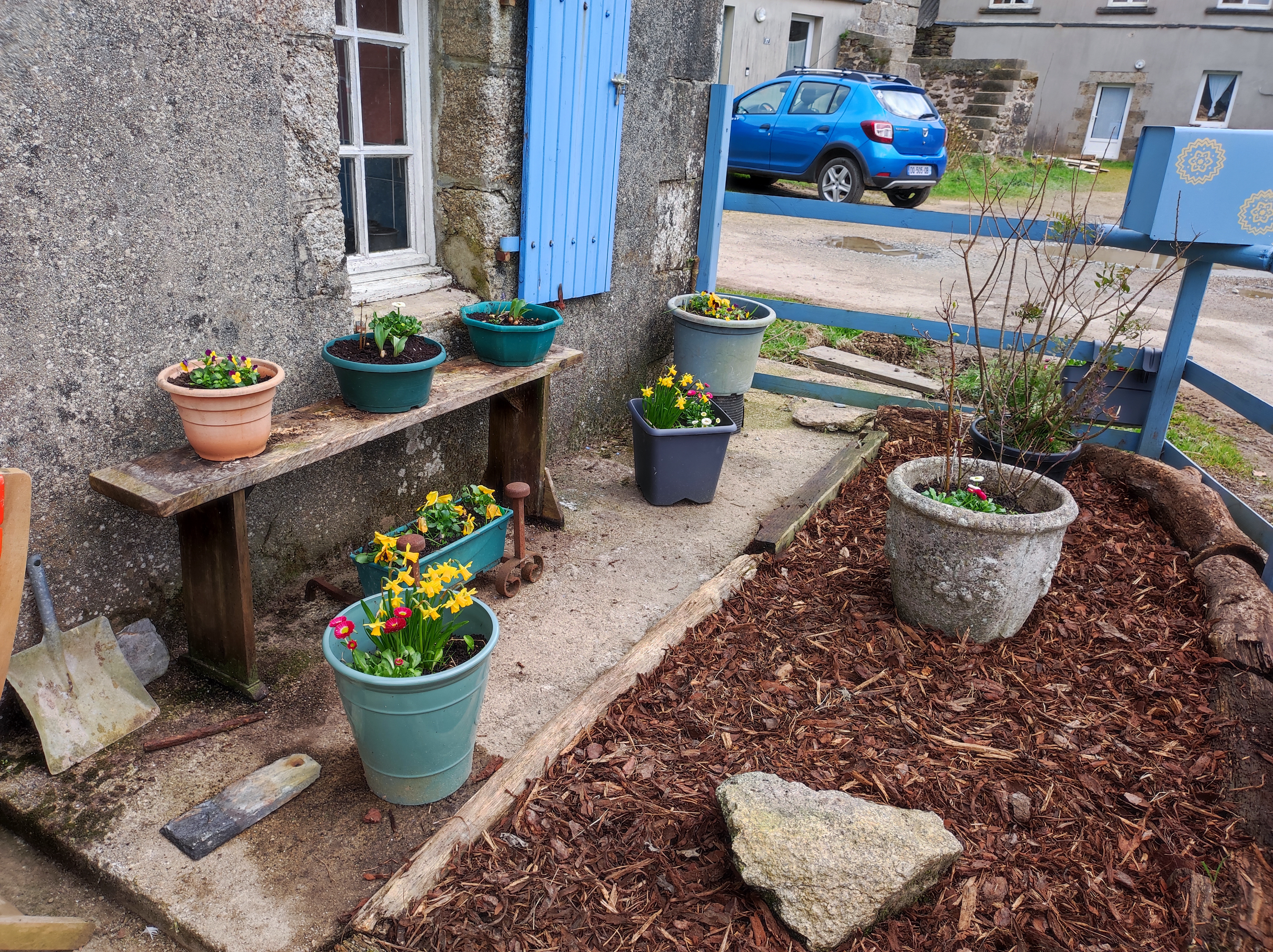 The front of our house has been an awful mess and we had a situation in which each time we came in and out more mud was dragged through. At the end of last week Chris made a start on clearing it up. Over the weekend he finished which included widening the path and creating a better path. Finally he re-did some of the pots, some already had daffodils that had regrown again from last year.