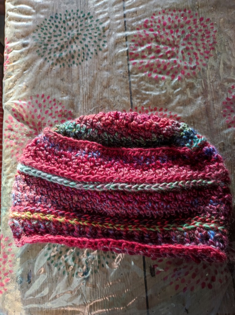 On a physical count I have finished hat number 5 and begun hat number 6. My plan is to have done at least 10 or 12 before I put them in the gîte, so I am about halfway there.
