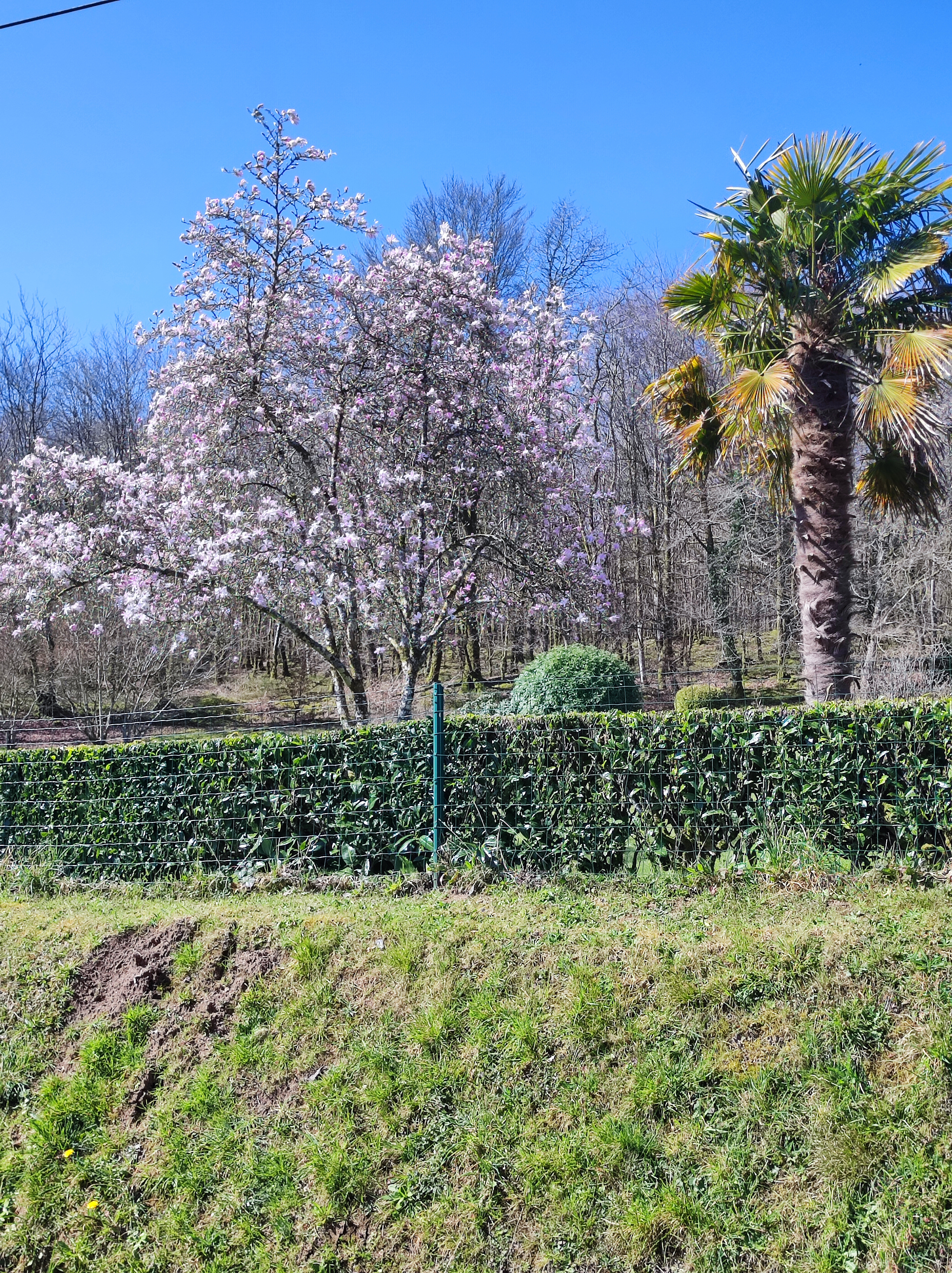 I walked home from the gîte in order to get changed to go out. The trees and flowers are beginning to look beautiful. It seems that things are really starting to grow both in our garden and in the poly tunnel too. The rhubarb that we thought had died last summer is really showing signs of growth. Hopefully there will be some to pick later in the summer.