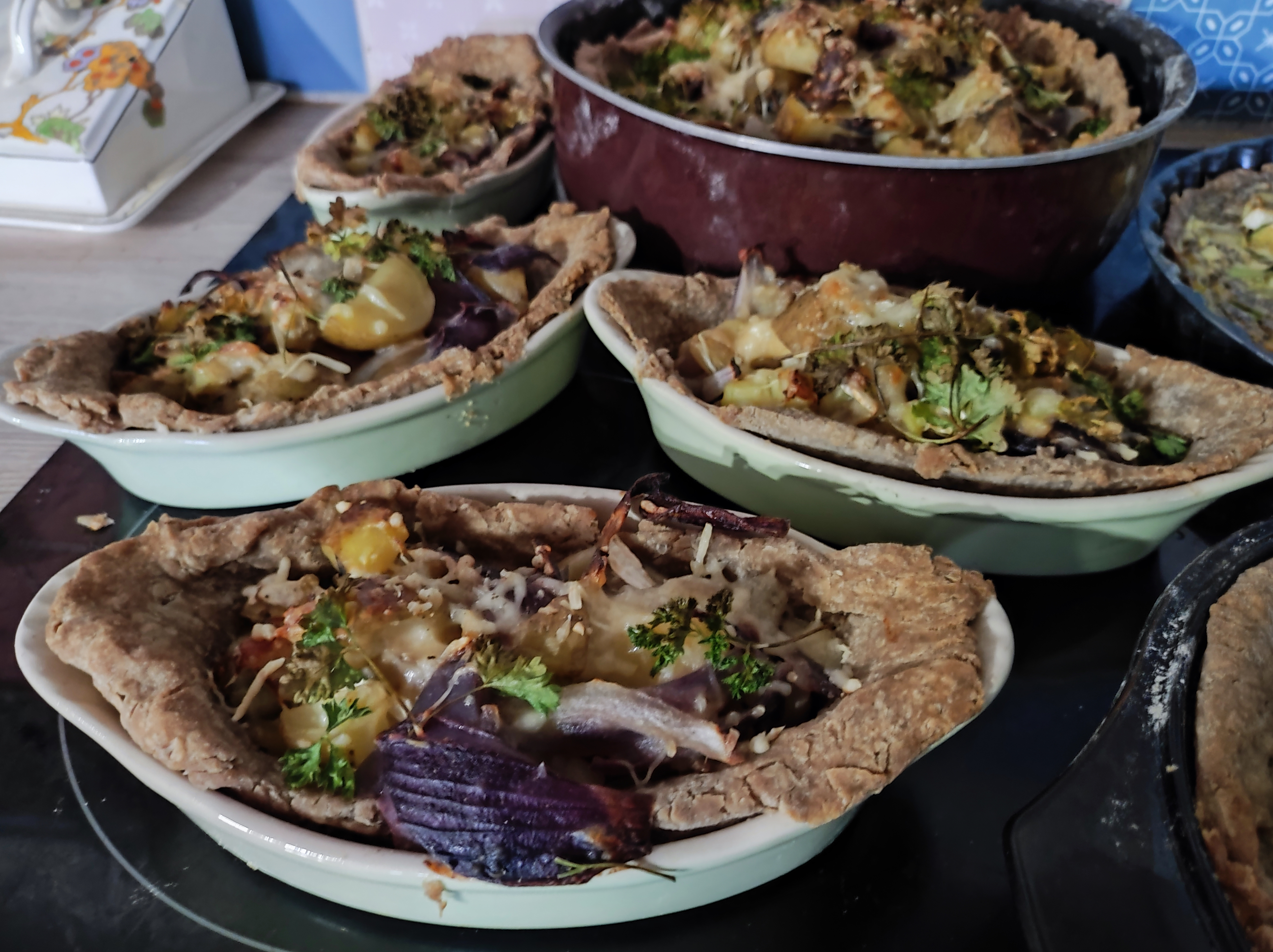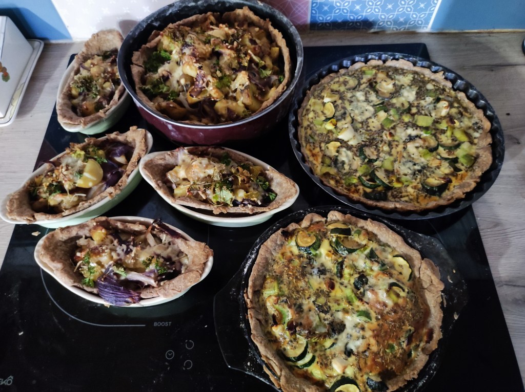 So back to the cooking. I had bought a block of margarine for making pastry. And in my infinite wisdom I decided that I might as well use all of it. So given it was 500g I had to add a kilo of flour. I had thought that I might freeze half of the pastry and use it later. However, it is gluten free and things, such as pastry, don’t always work as well after freezing. So I realized that I needed to use all of it today. I knew what I putting in the quiche, leek and courgette with blue cheese. What was I going to make with the rest? Suddenly I remembered that I used to make Homity pie really regularly and I haven’t made it in years. Thankfully I had the ingredients, well almost, no cheddar but a suitable alternative. Having bought individual dishes a while ago I decided to make four in there and a big one to go in the freezer. At the end there was a little piece of pastry left, so I put some camembert and sun-dried tomatoes in it and cooked it for my lunch. It was delicious.