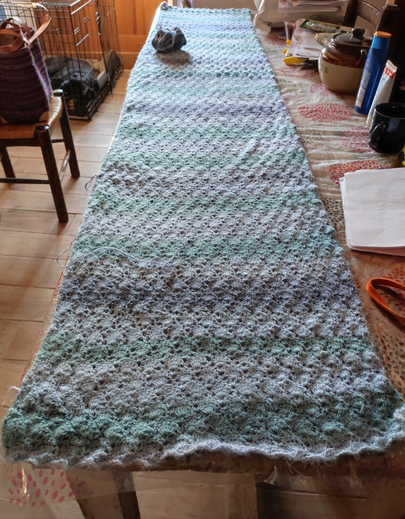 Yesterday I finished the main section of the crochet project which is quite exciting. It seemed too small to begin with. However after blocking, the process of damping, stretching and drying, I was relieved to find that the piece met the expected size. I have started the sleeves. It will take a while yet but I am pleased with the progress that I am making.