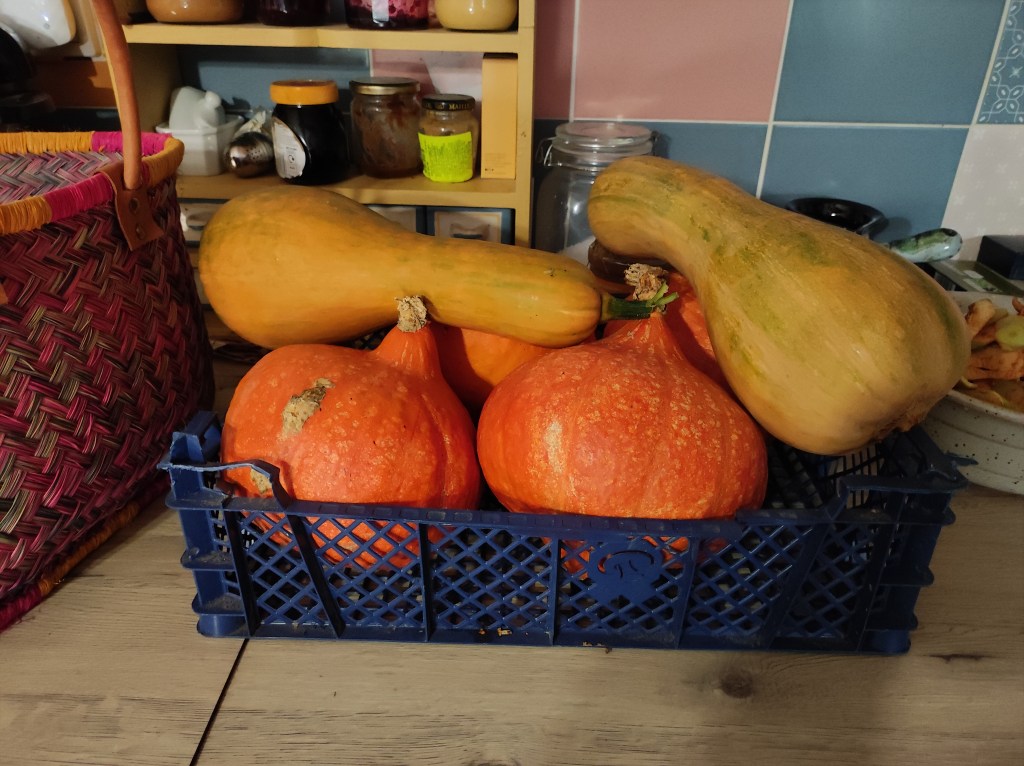 Earlier in the week I was given quite a lot of vegetables by our local farmer. We have potatoes and squash. On Tuesday I made roasted squash soup. I have several more left with which I could make more soup or something else. Do let me know if you are interested in seeing me make roasted squash soup.
