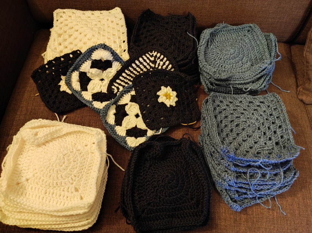 Instead I did continue to make squares for the blanket. Chris has redrawn the plan, so that works. I only need to make 4 more squares. In reality I have made more than 70 already. I changed the plan and the layout after I had started making them. Any additional squares will be used to create a cushion or two. I have also managed to write out the pattern for the square which will be helpful for those using the video.